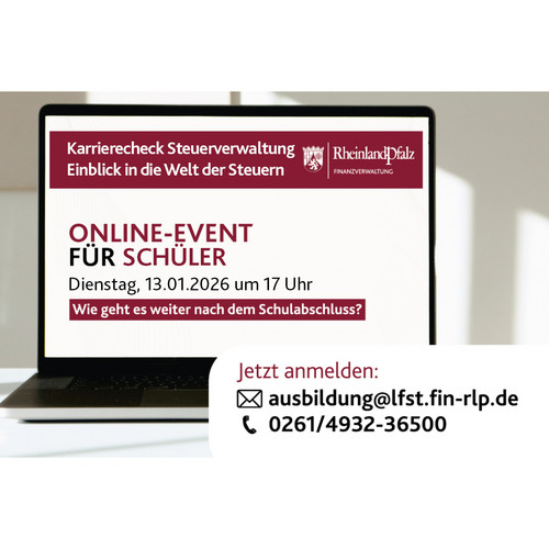 Für Schülerinnen und Schüler, die sich über mögliche Ausbildungs- und Berufswege nach ihrem Schulabschluss informieren wollen, vermittelt die Steuerverwaltung Rheinland-Pfalz am 13. Januar 2026 um 17:00 Uhr, online einen Blick in die Welt der Steuern und auf die Karriereperspektiven in der Steuerverwaltung.